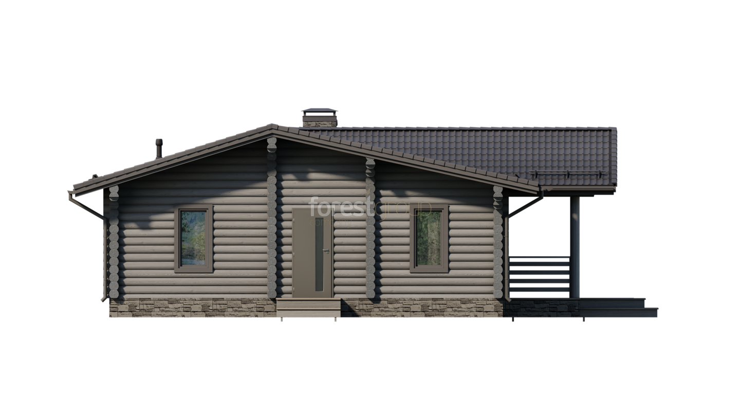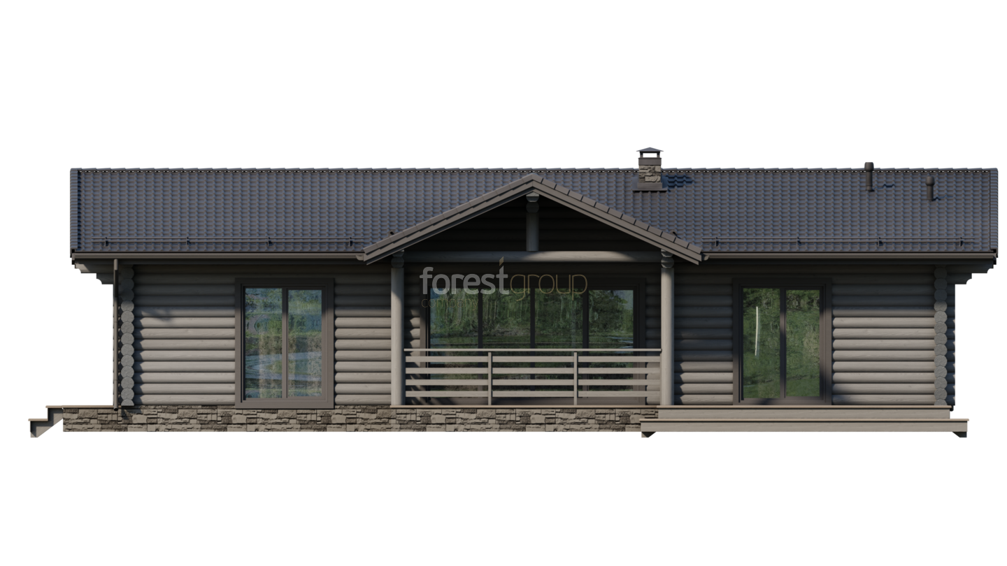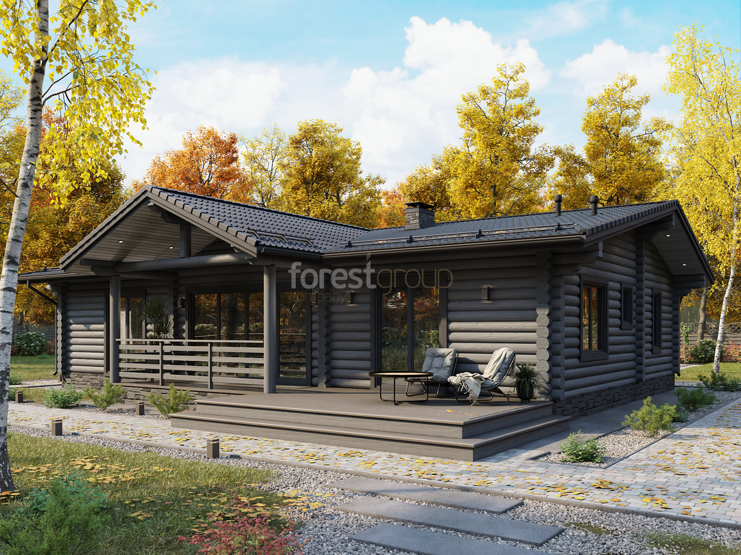 Одноэтажный загородный дом из оцилиндрованного бревна с тремя спальнями и террасой.