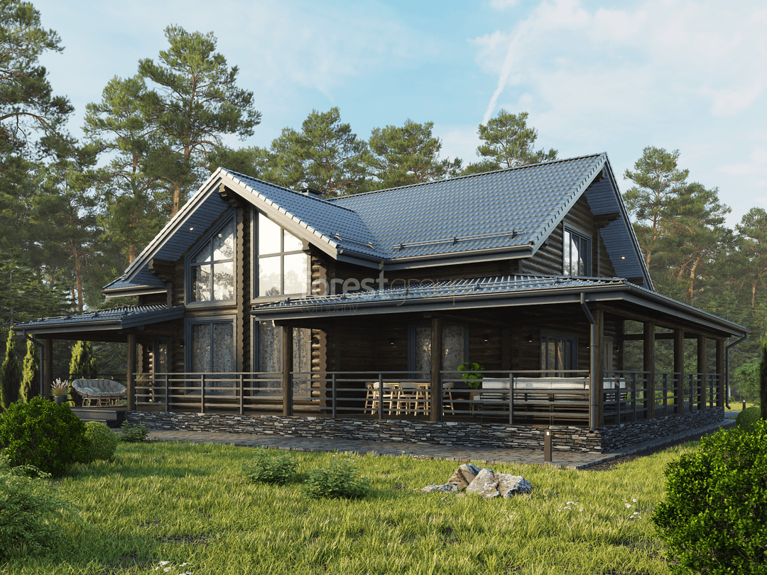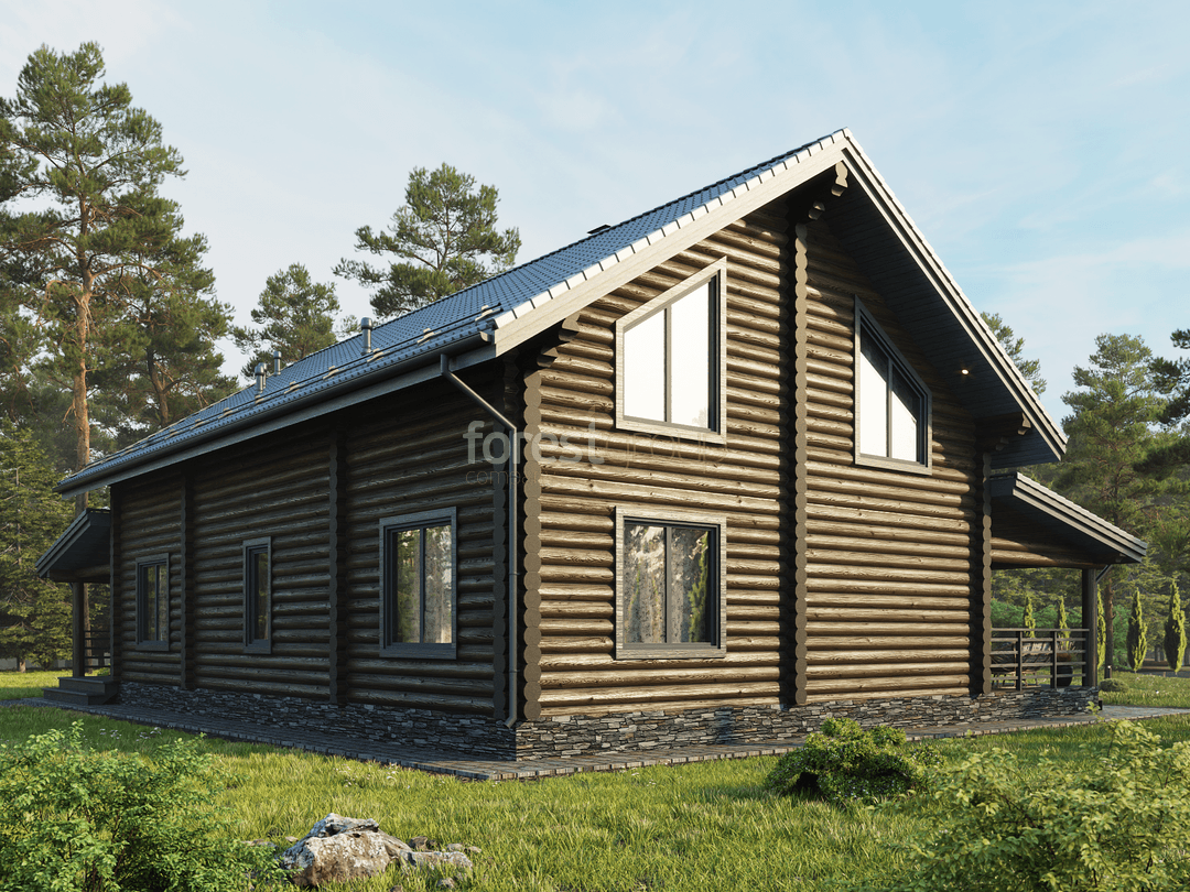 Двухэтажный загородный дом из оцилиндрованного бревна с тремя спальнями и большой террасой.