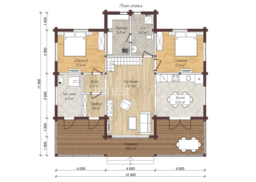 Двухэтажный дом из клееного бруса с большой террасой и 3 спальнями.