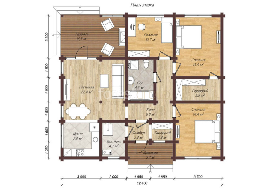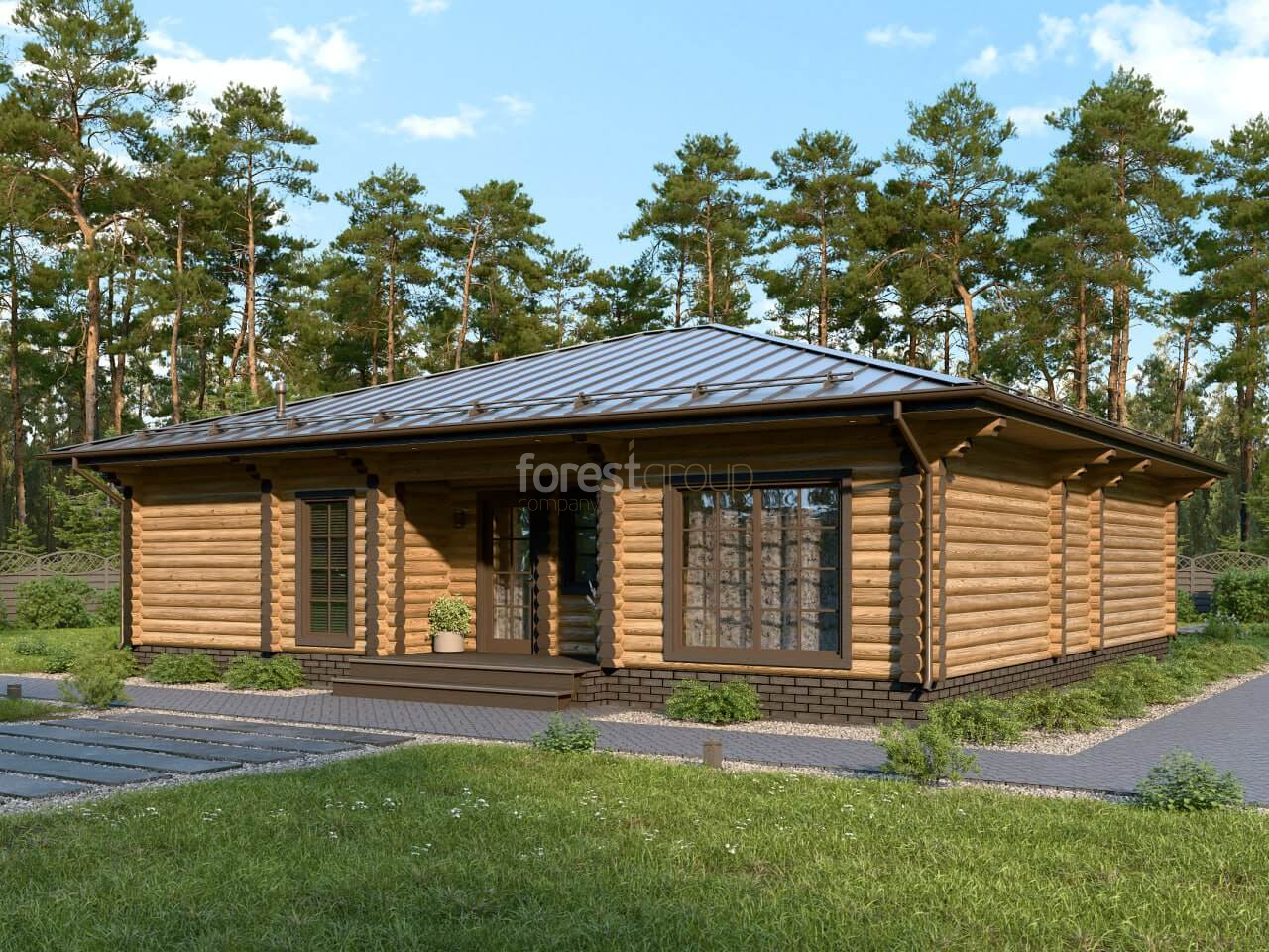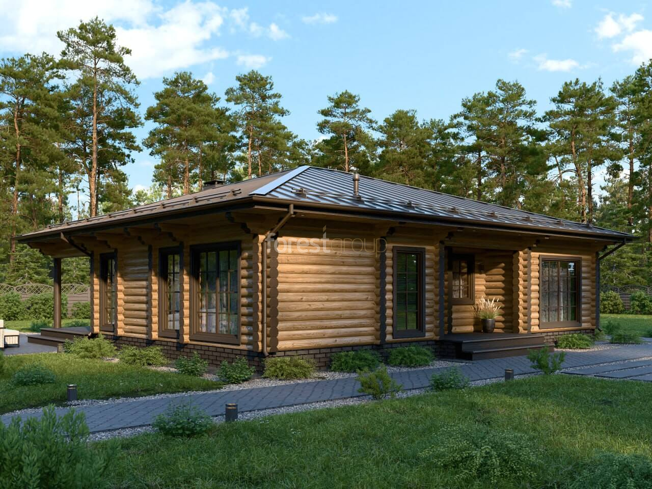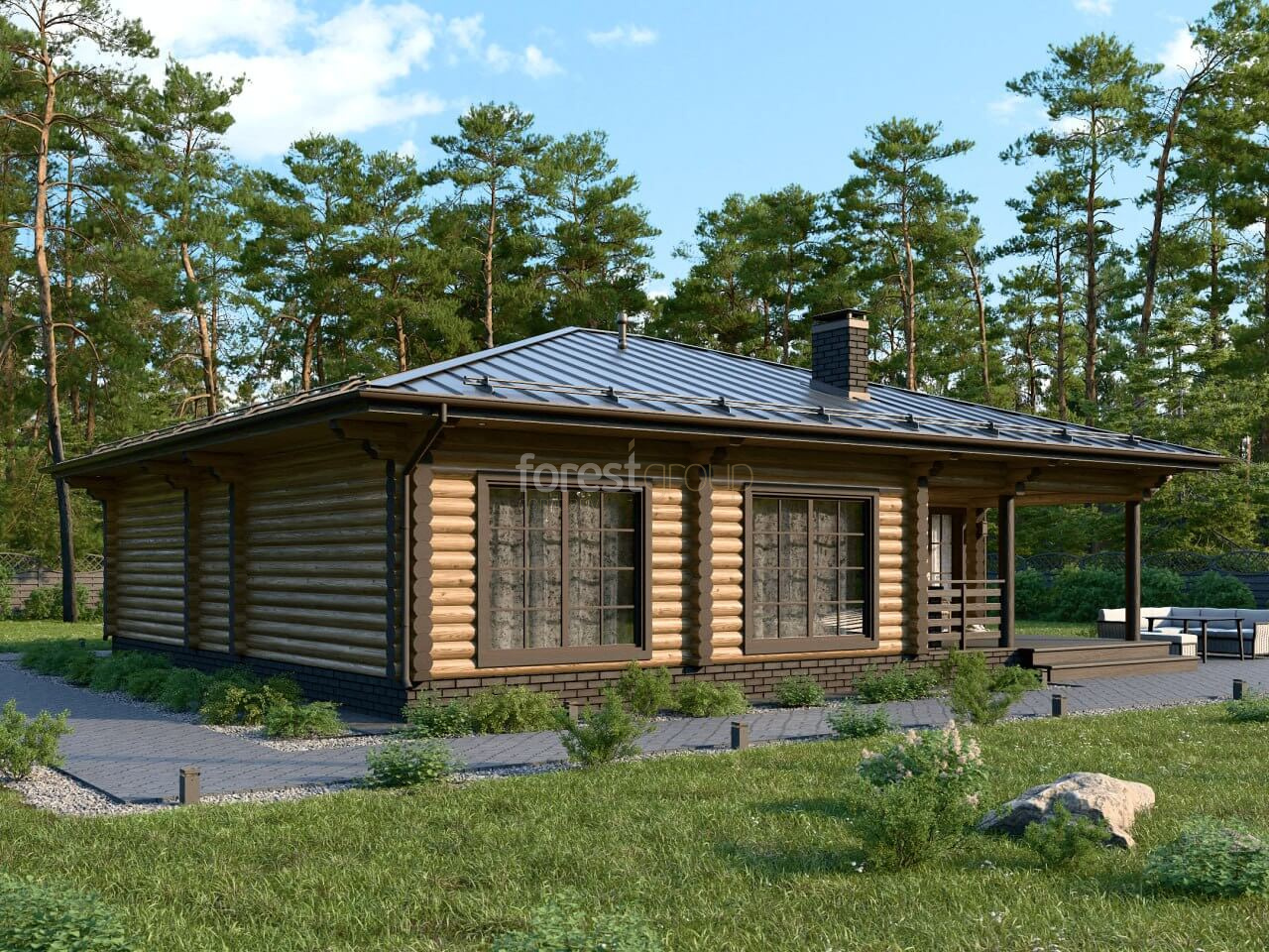 Одноэтажный дом из оцилиндрованного бревна с 3-мя спальнями и большой гостиной