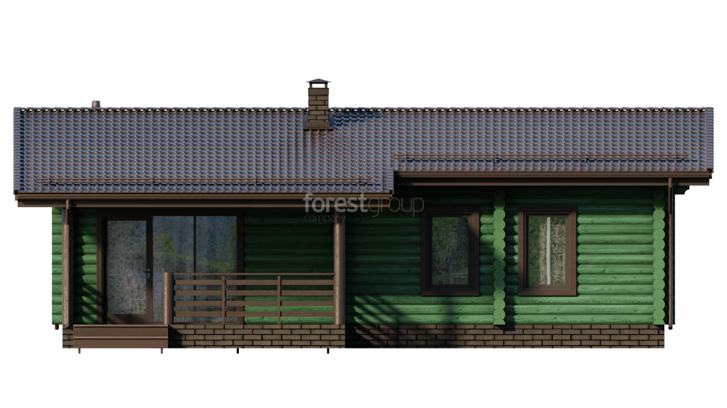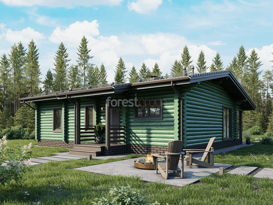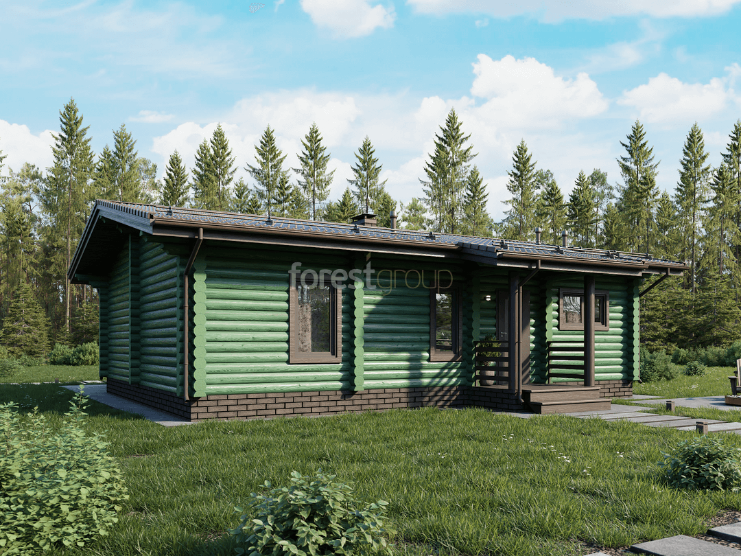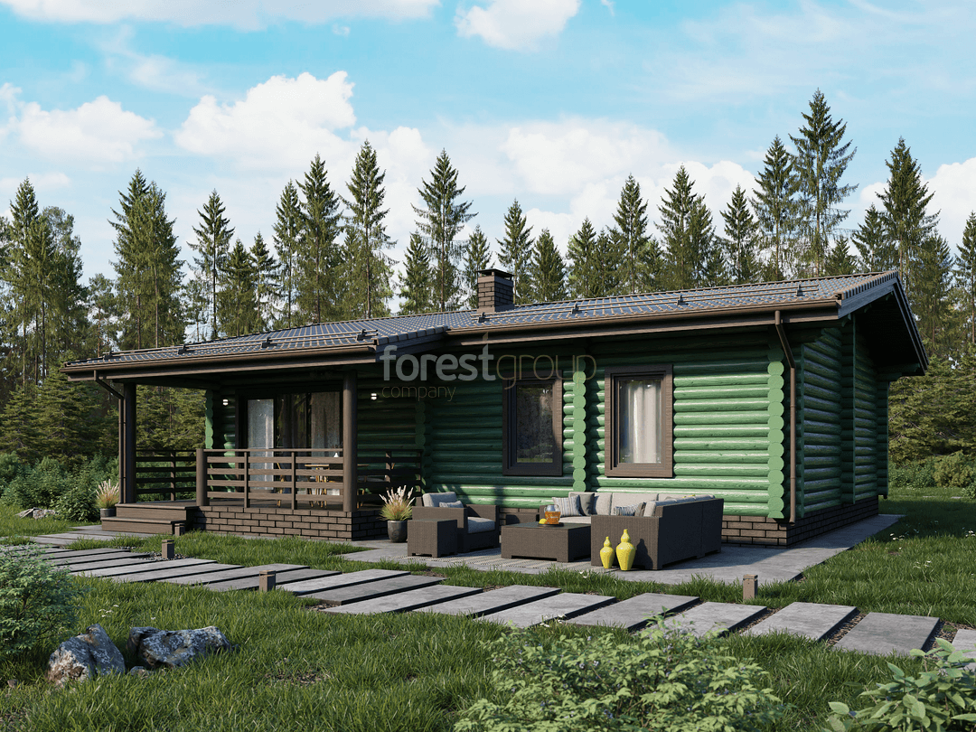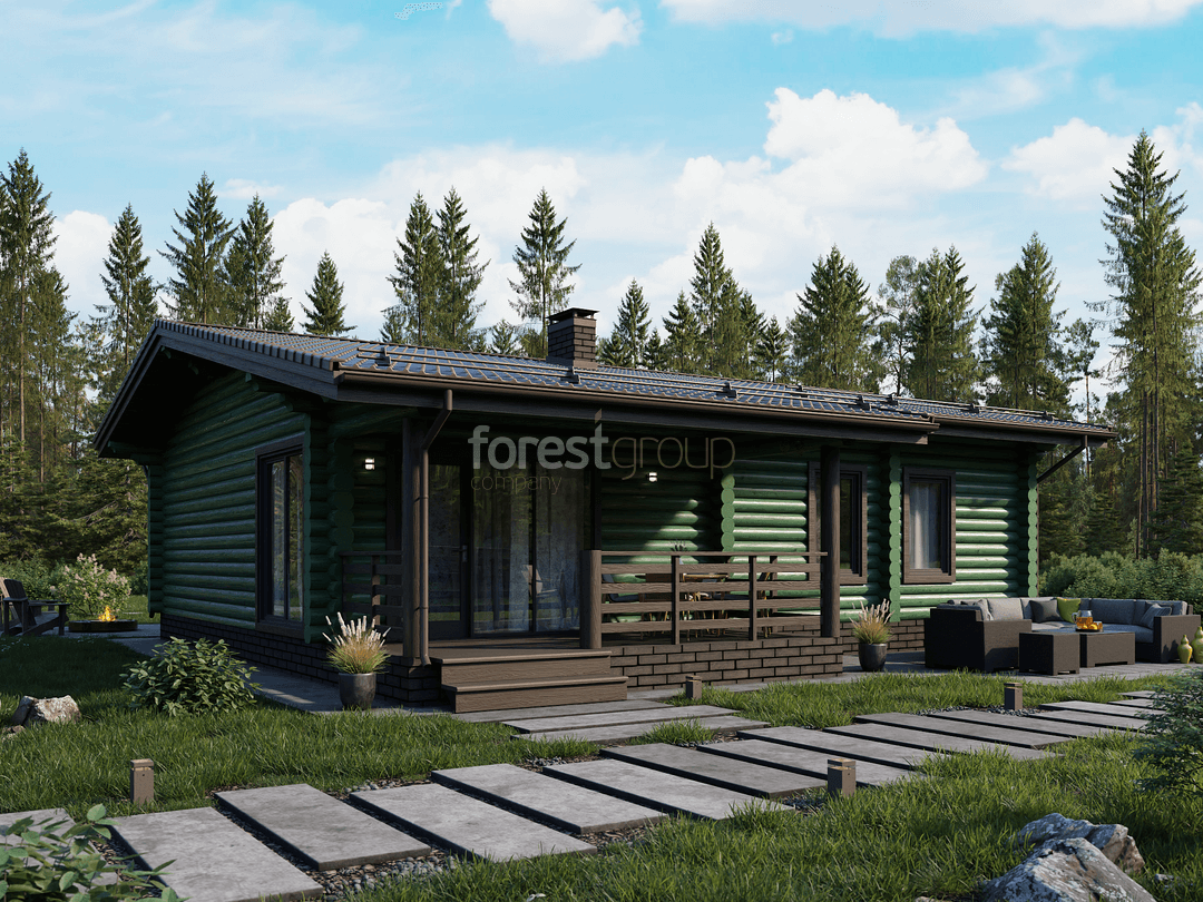 Одноэтажный загородный дом из оцилиндрованного бревна с тремя спальнями и террасой.