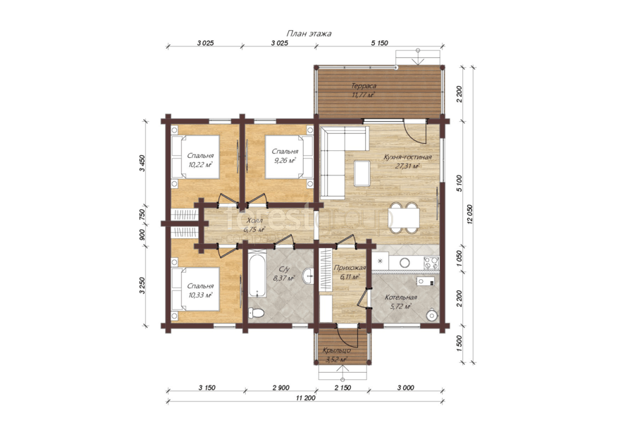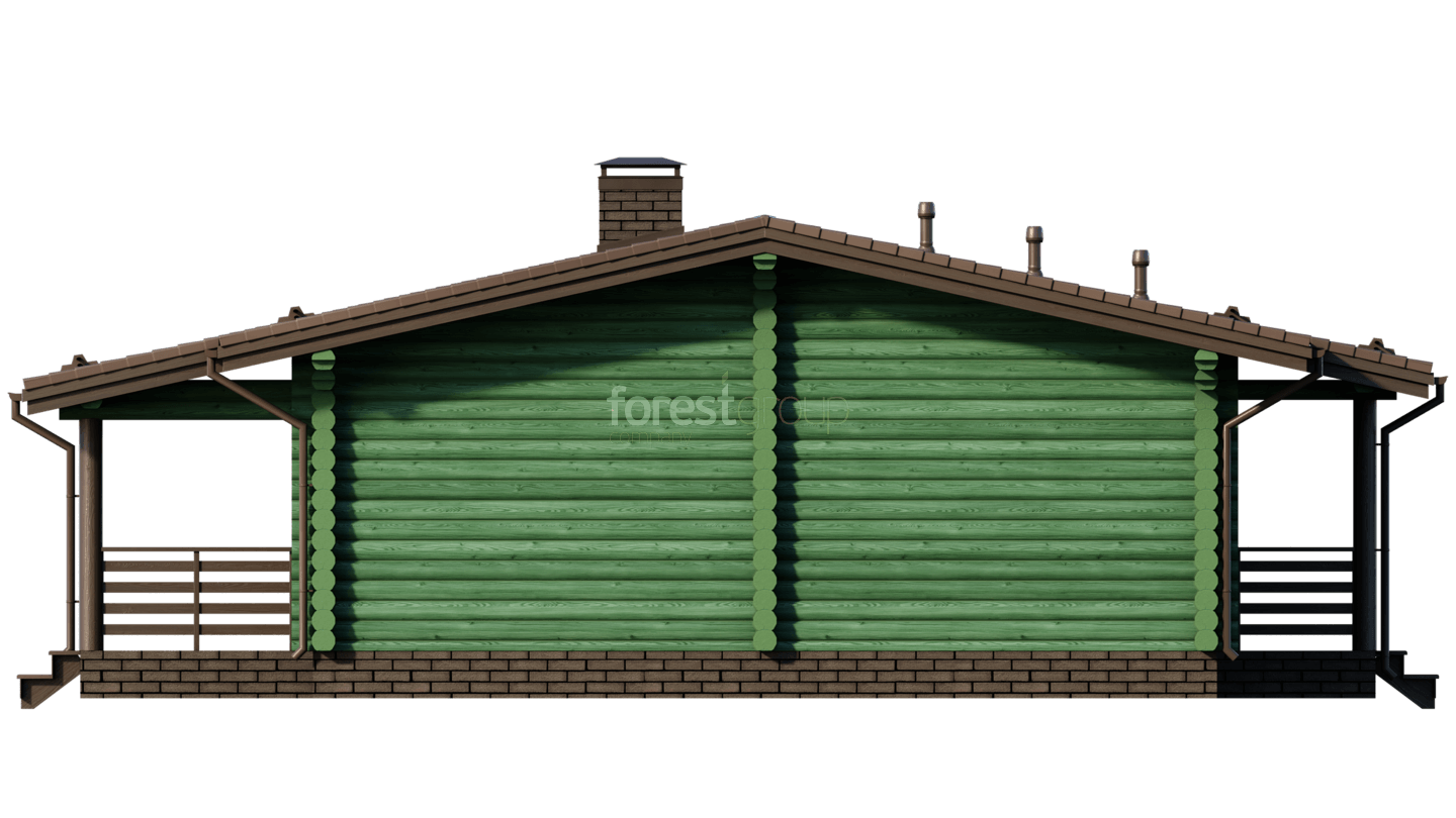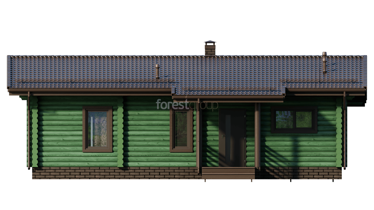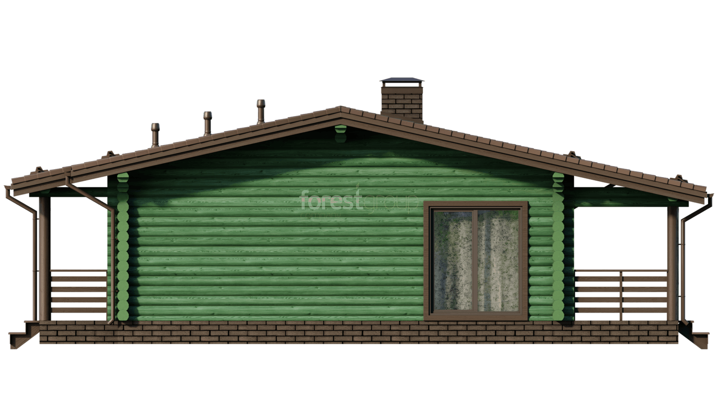 Одноэтажный загородный дом из оцилиндрованного бревна с тремя спальнями и террасой.