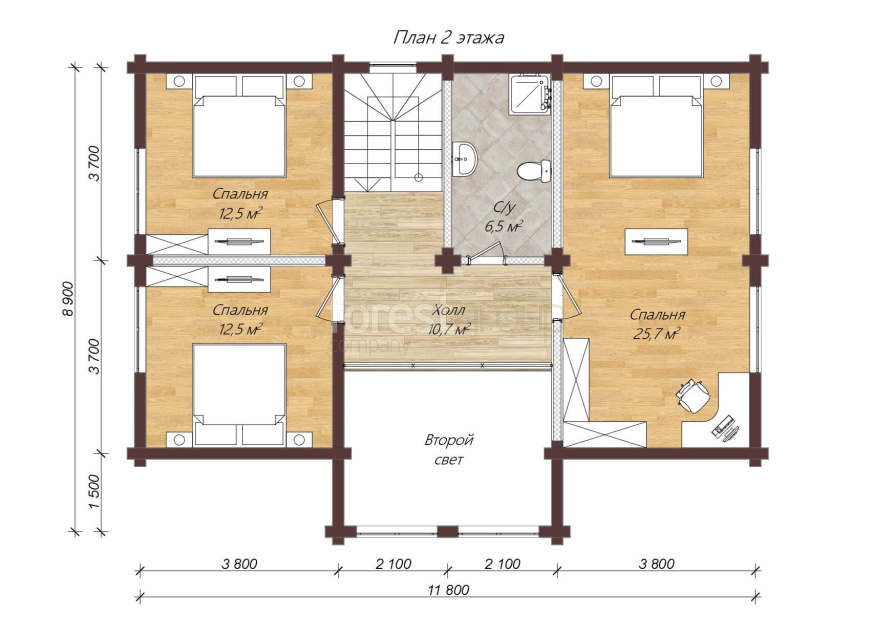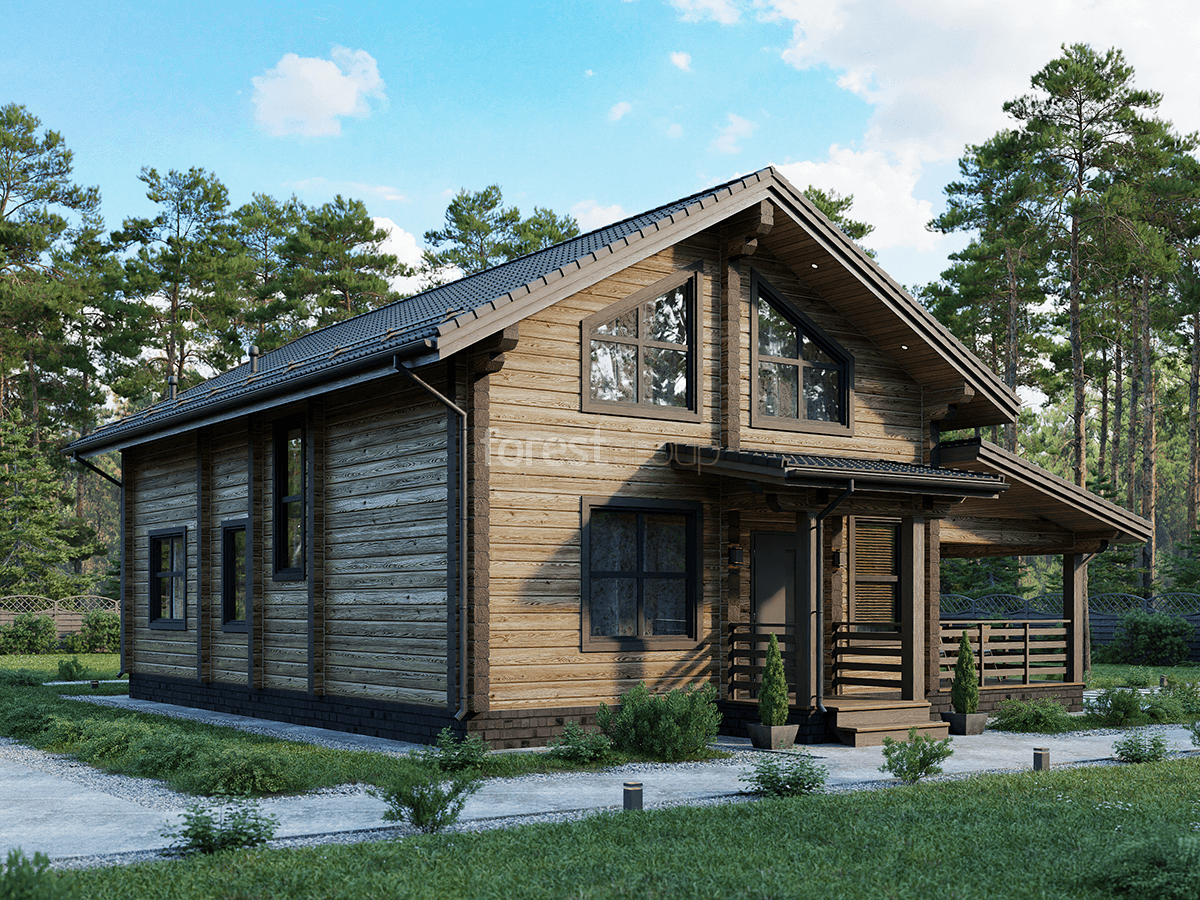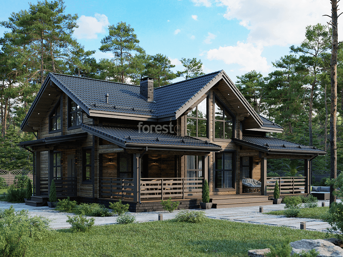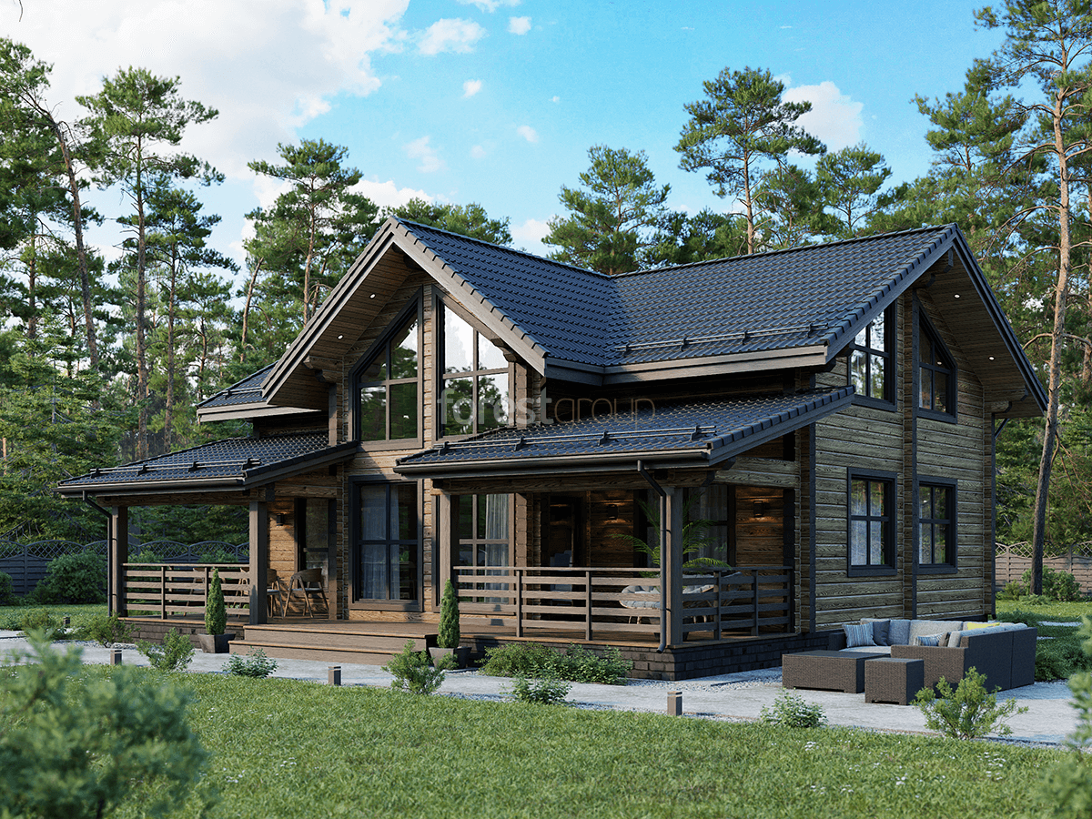 Солидный двухэтажный дом из бревна с баней, в проекте 3 спальни, терраса.