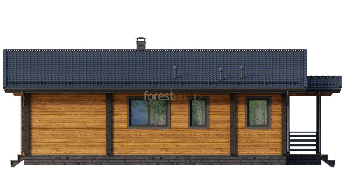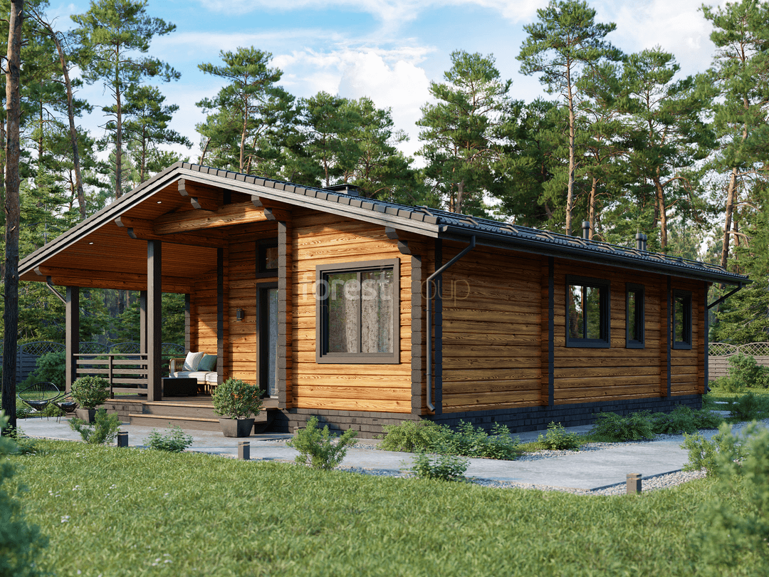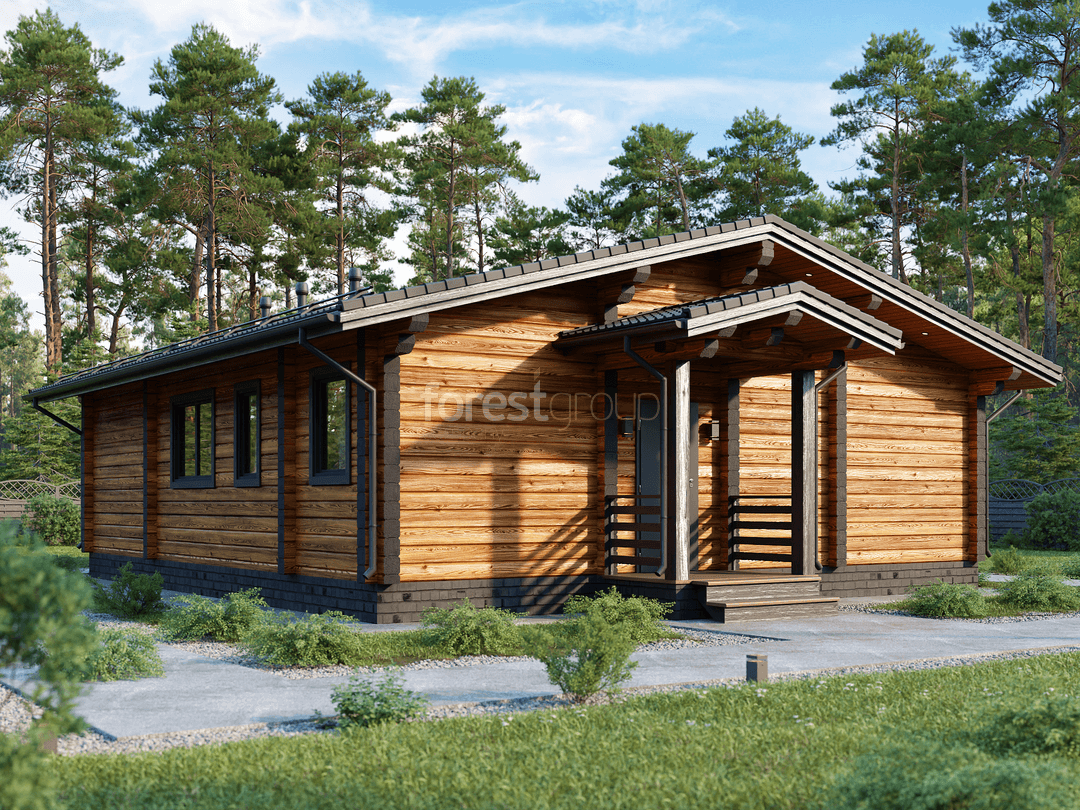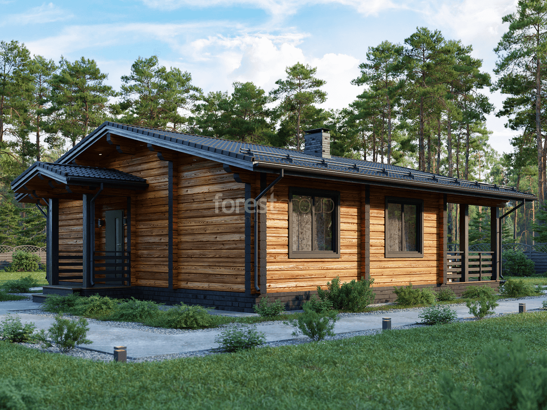 Одноэтажный дом из клееного бруса, в проекте 3 спальни и большая терраса.