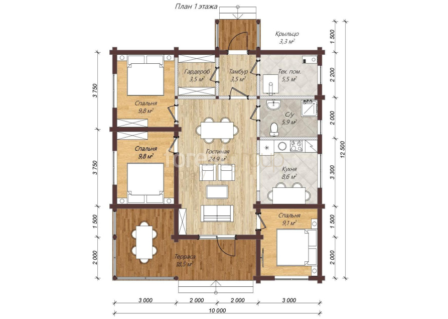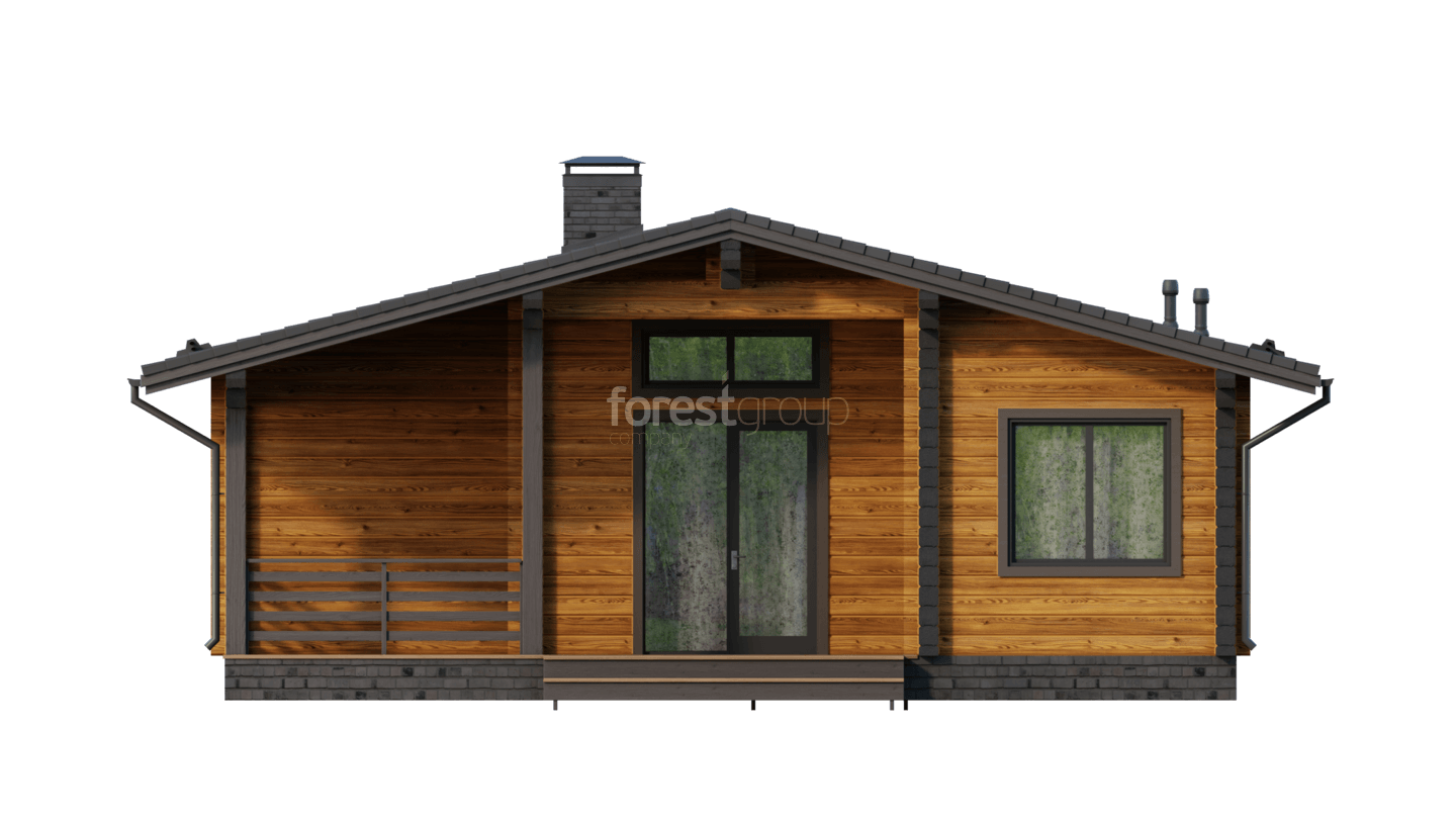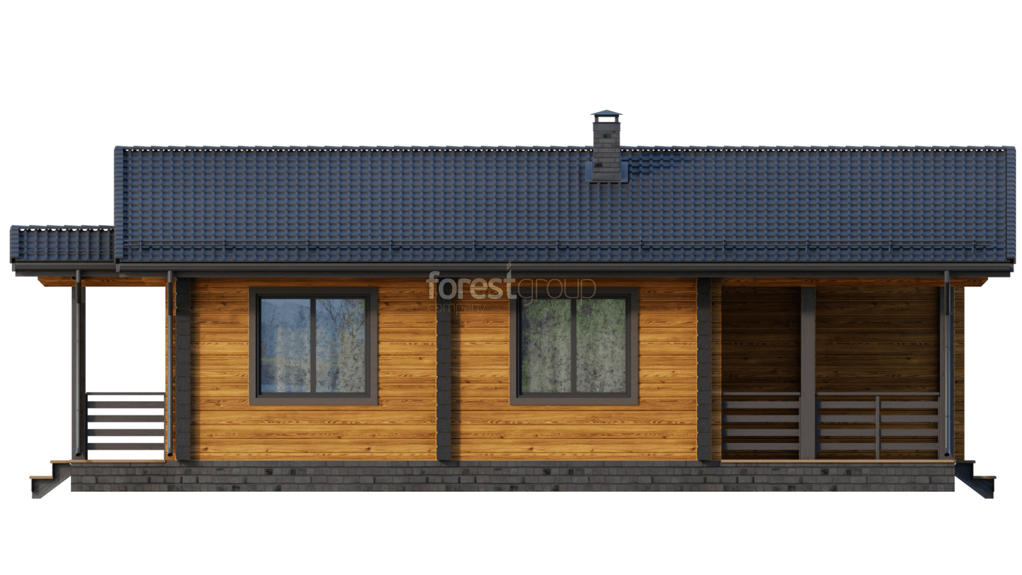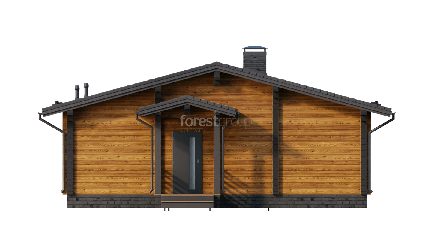 Одноэтажный дом из клееного бруса, в проекте 3 спальни и большая терраса.