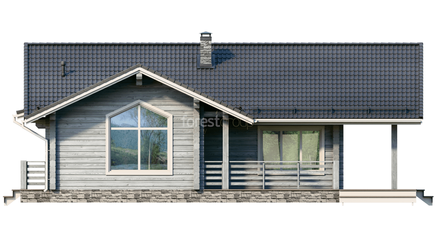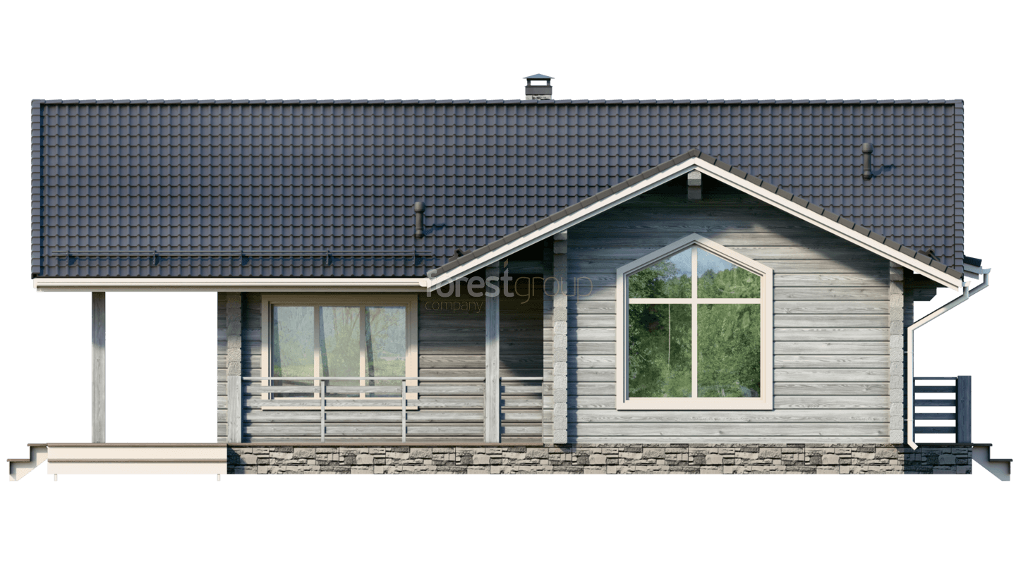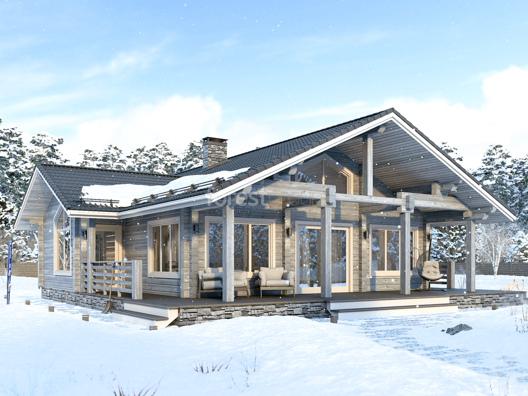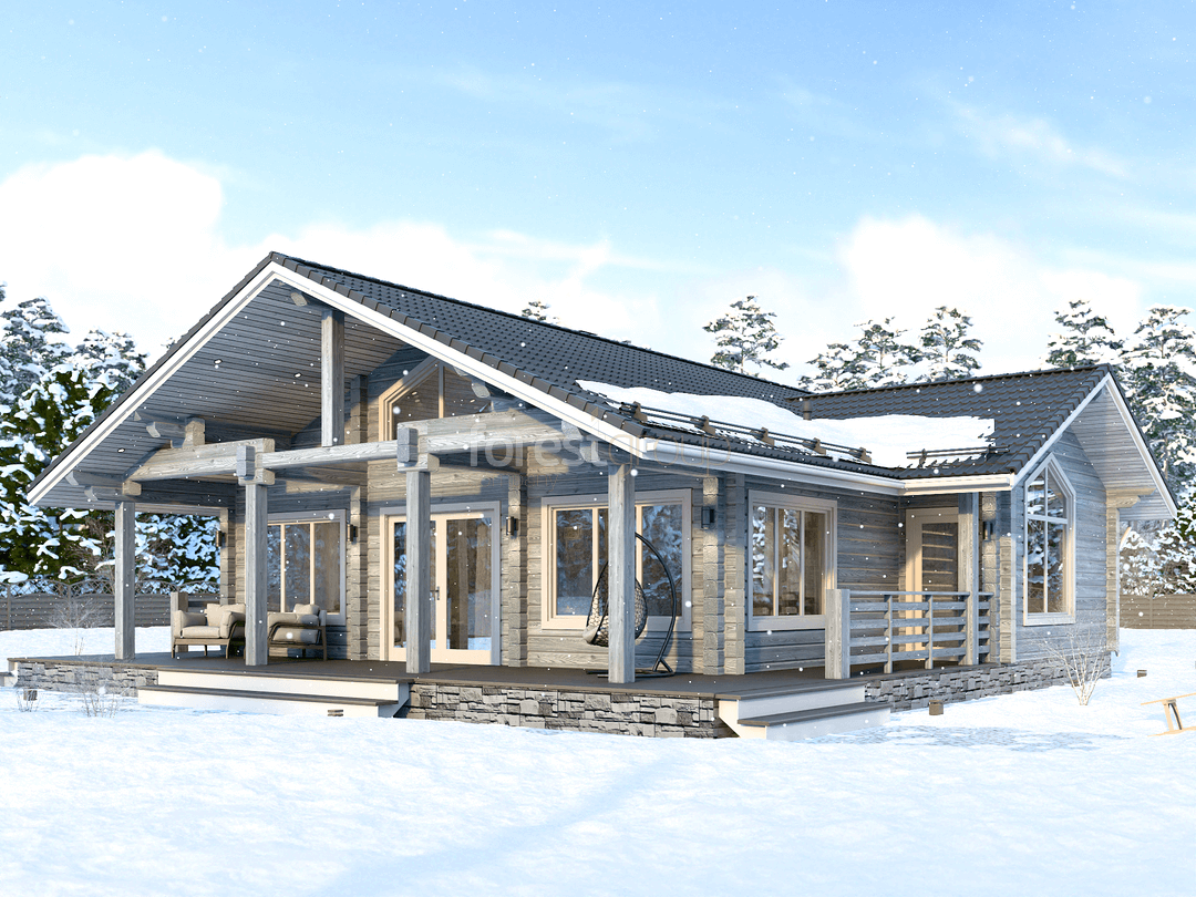 Двухэтажный дом из клееного бруса с большой террасой и 2 спальнями.