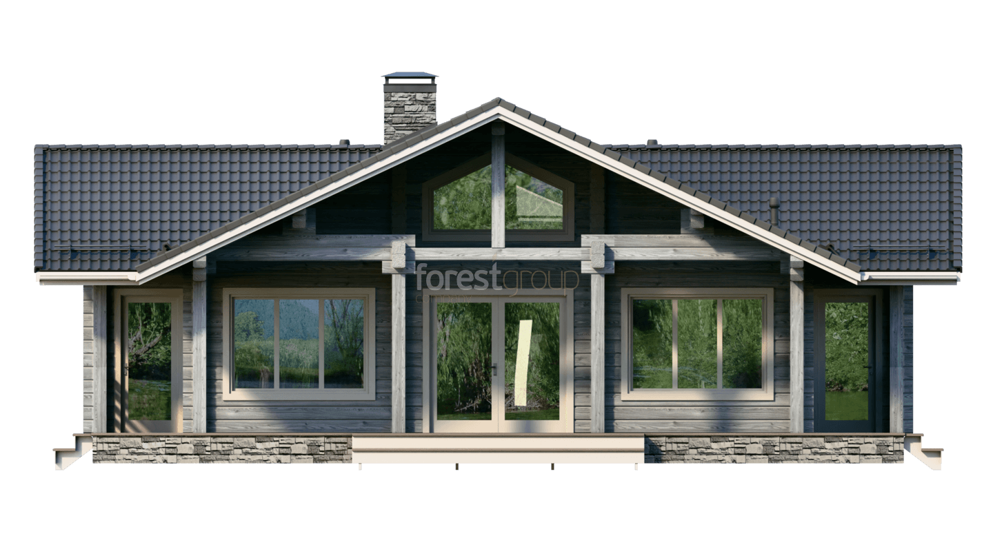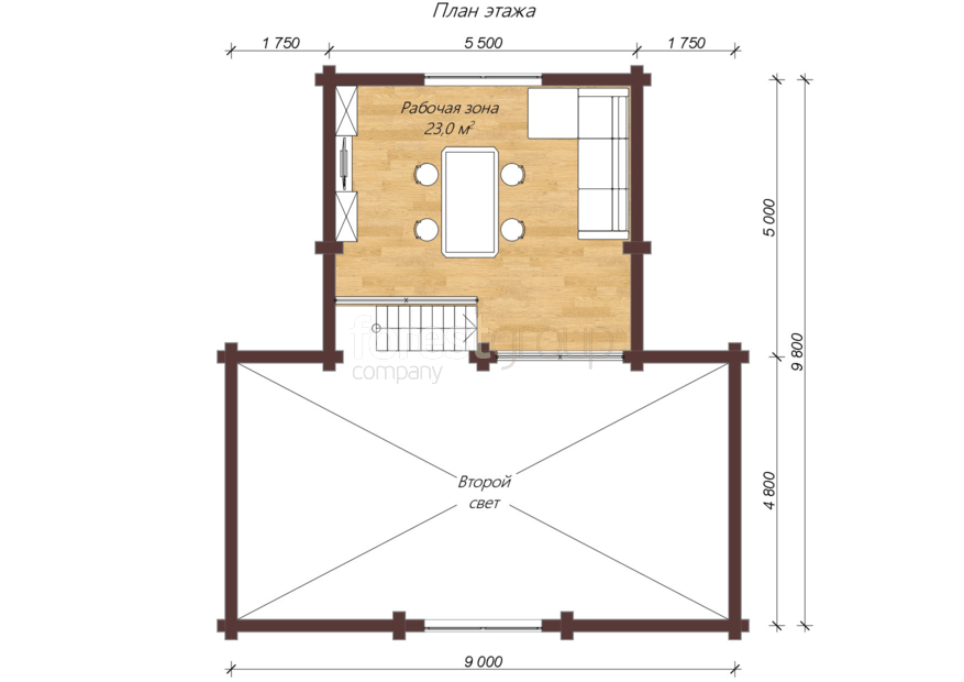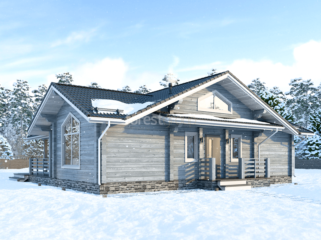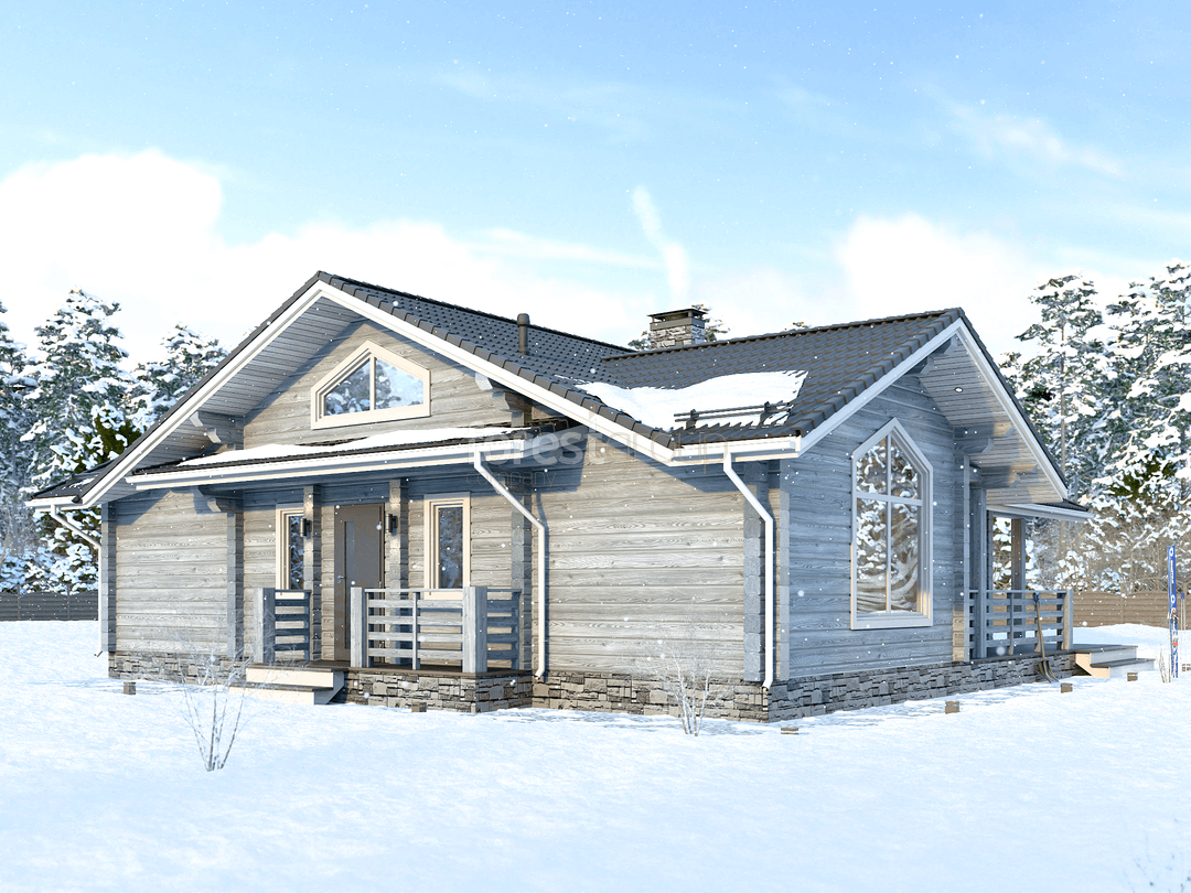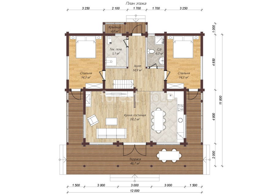 Двухэтажный дом из клееного бруса с большой террасой и 2 спальнями.