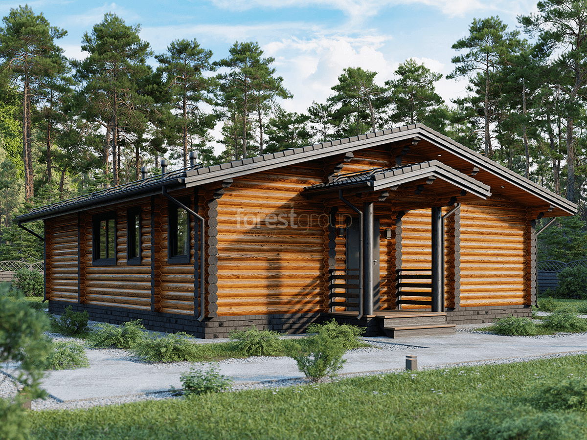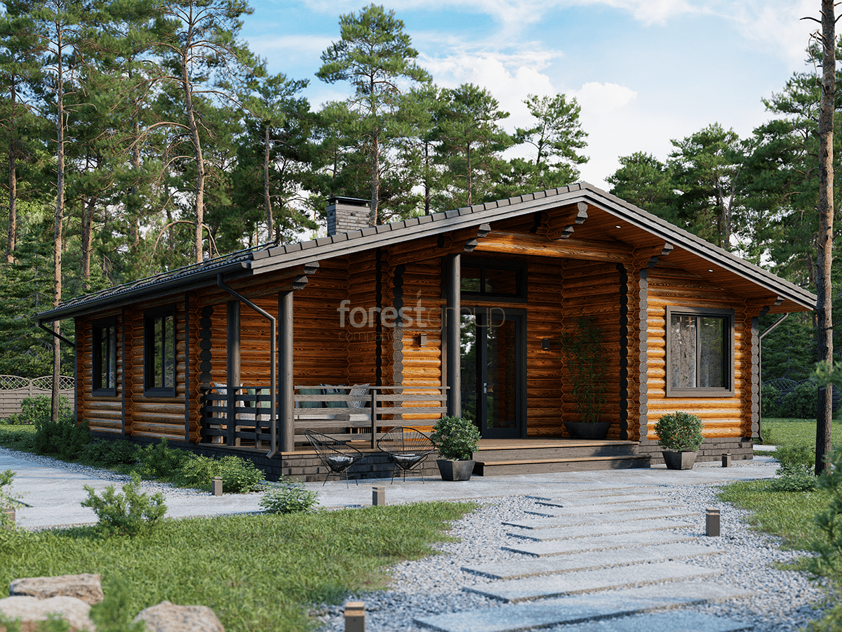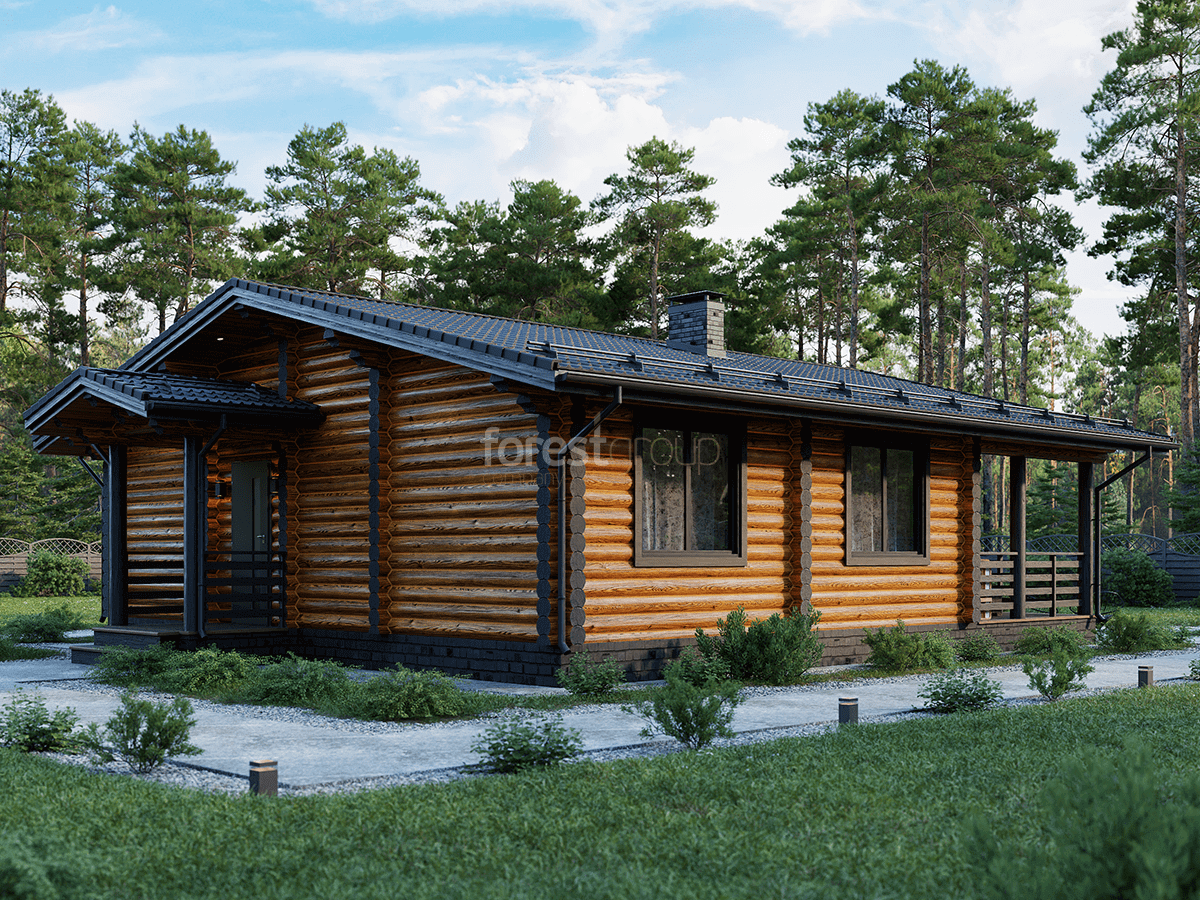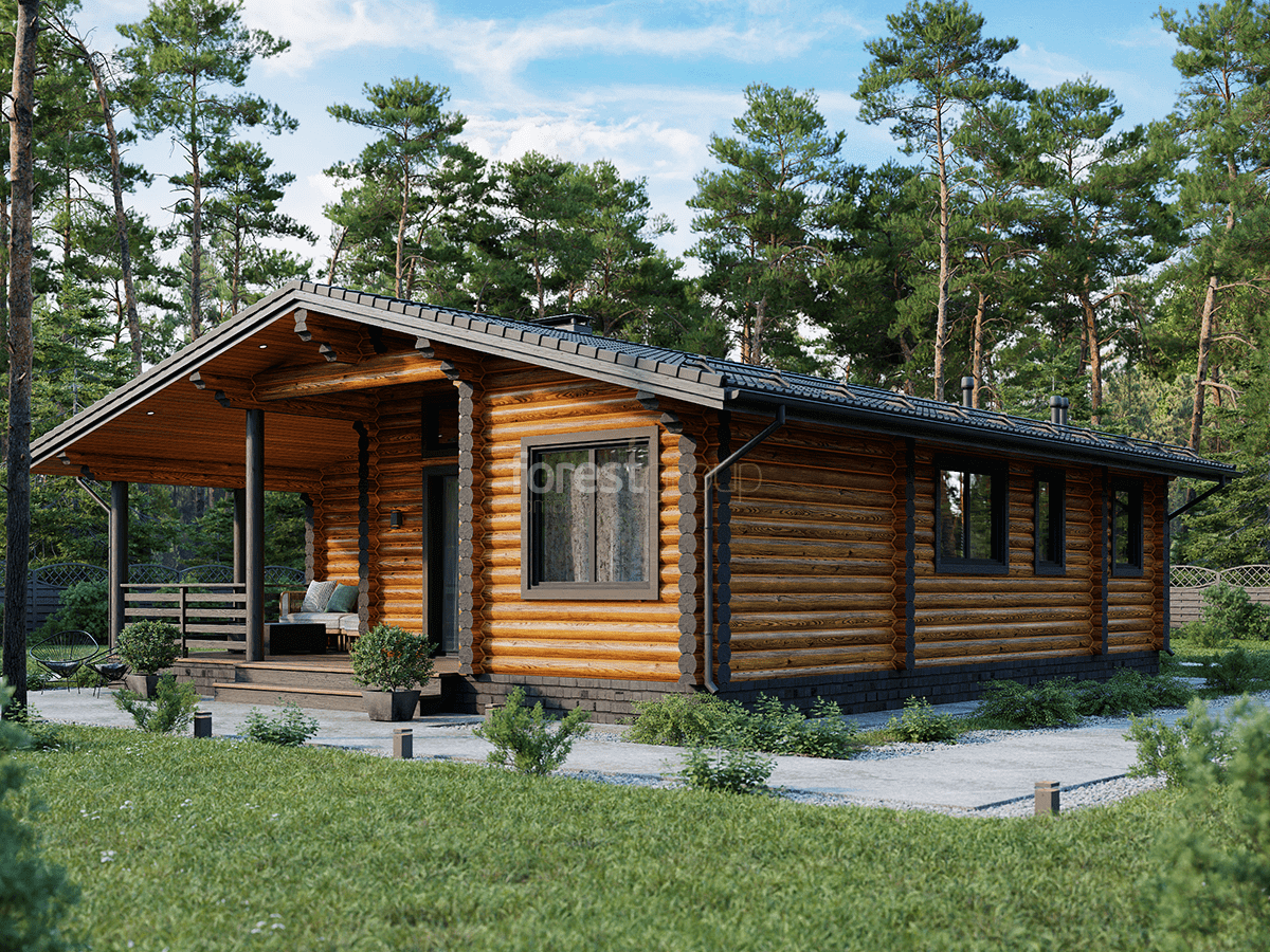 Уютный одноэтажный дом из бревна с большой террасой.