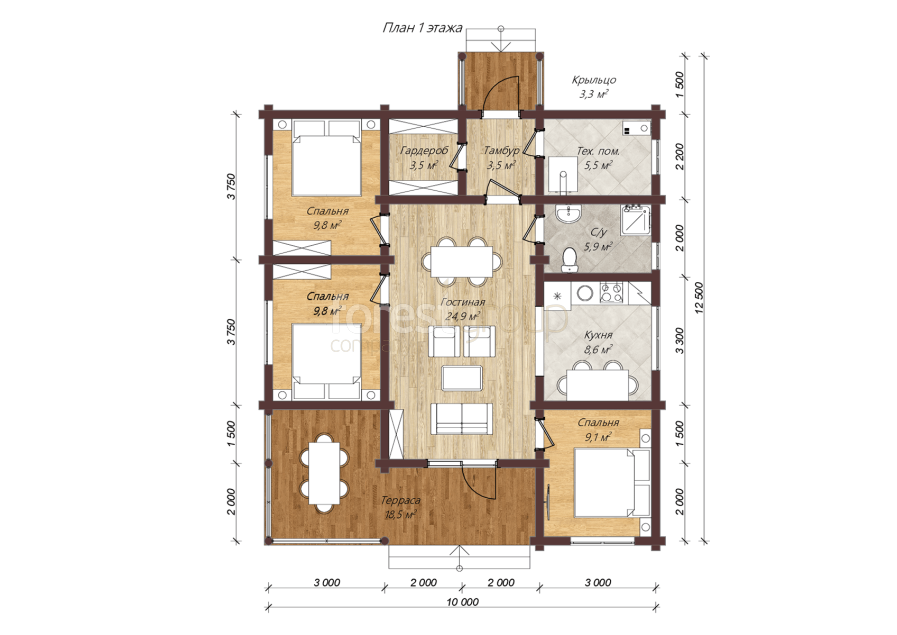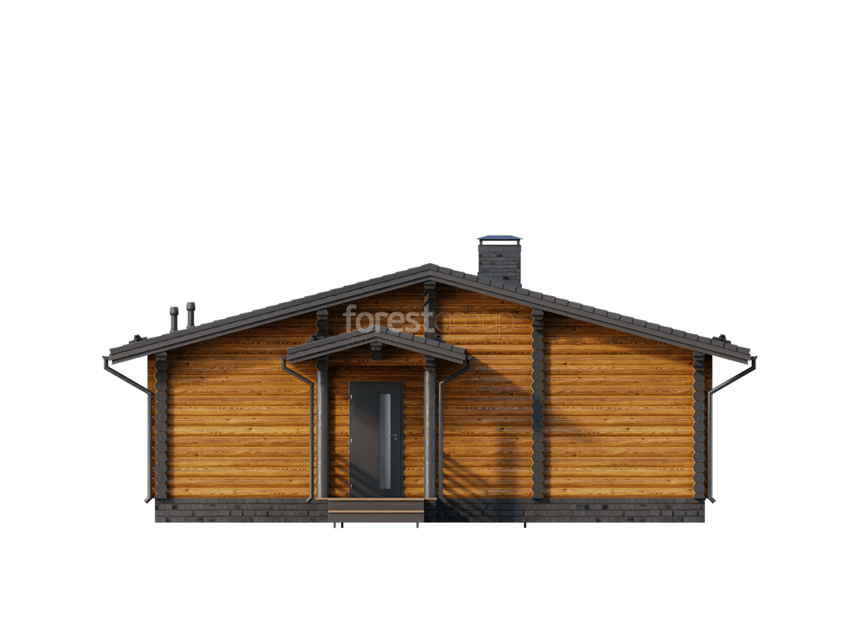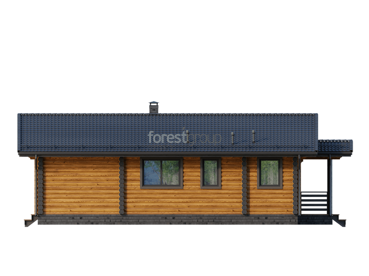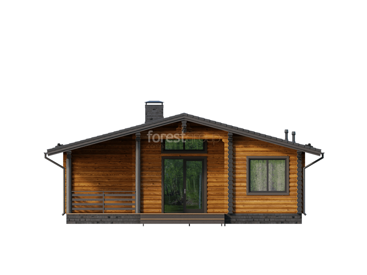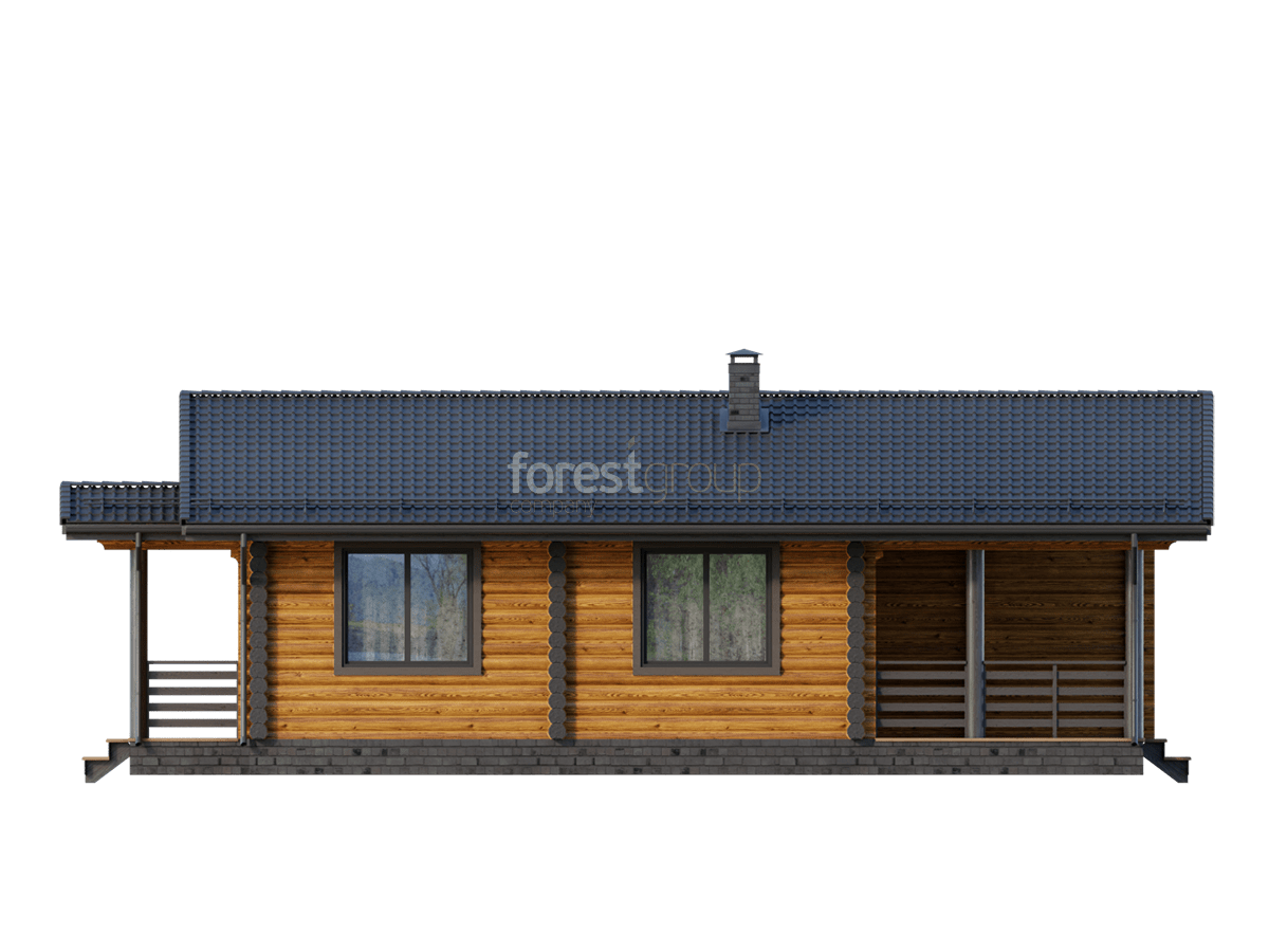 Уютный одноэтажный дом из бревна с большой террасой.