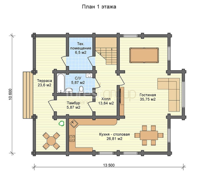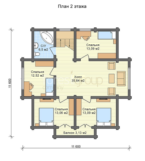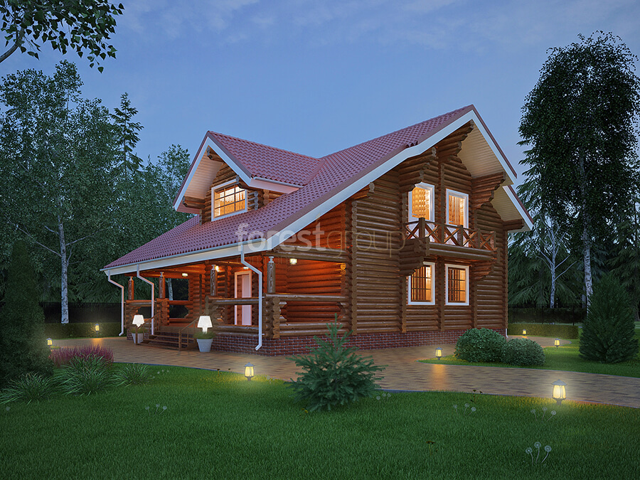 Двухэтажный дом из бревна с 4 спальнями, террасой и балконом