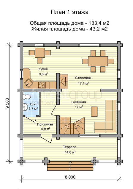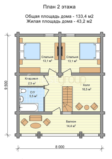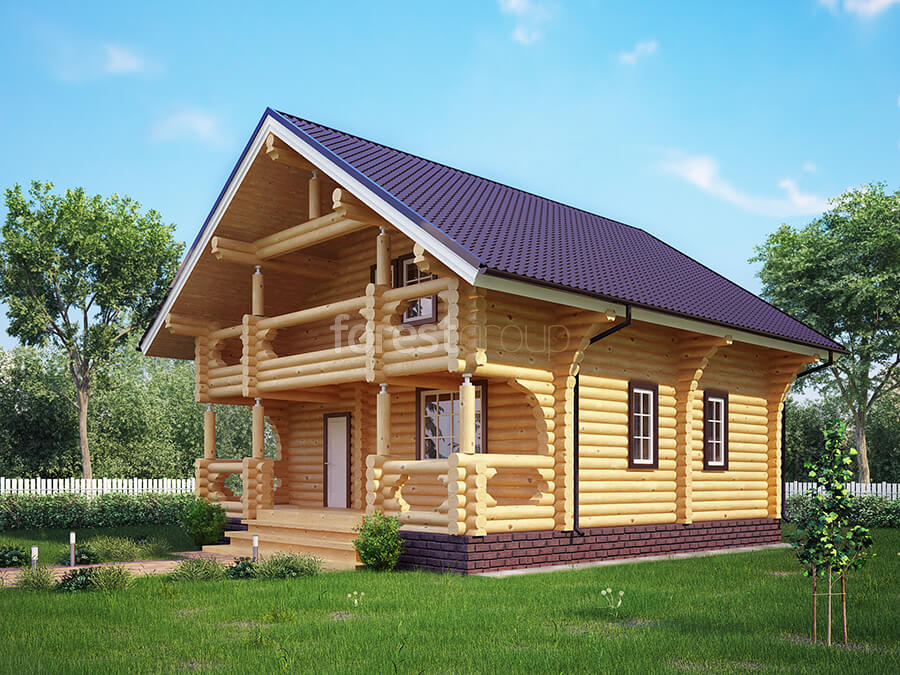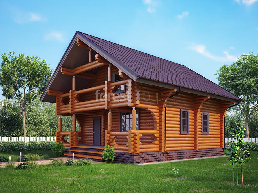 Двухэтажный дом из бревна с большой террасой, 2 спальнями и балконом