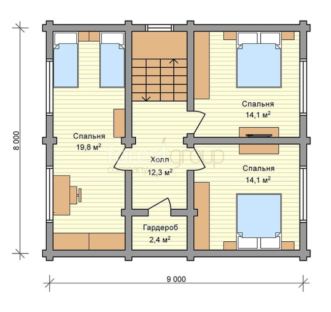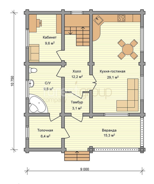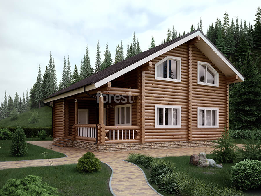 Двухэтажный дом из бревна с 3 спальнями, верандой и крыльцом