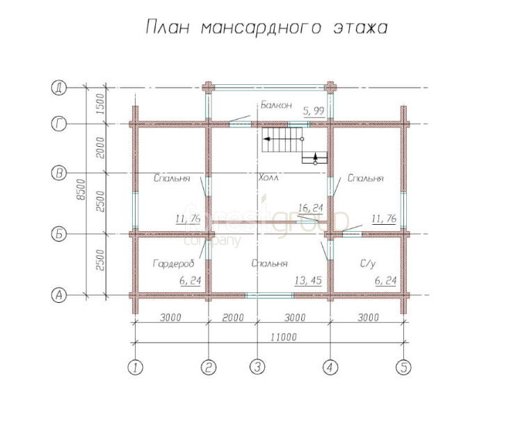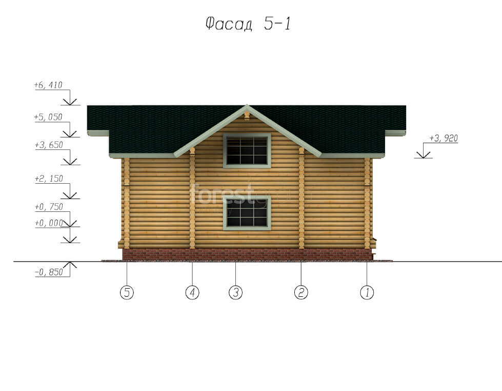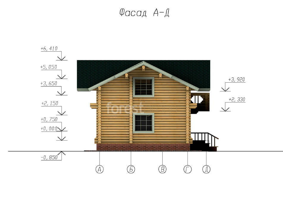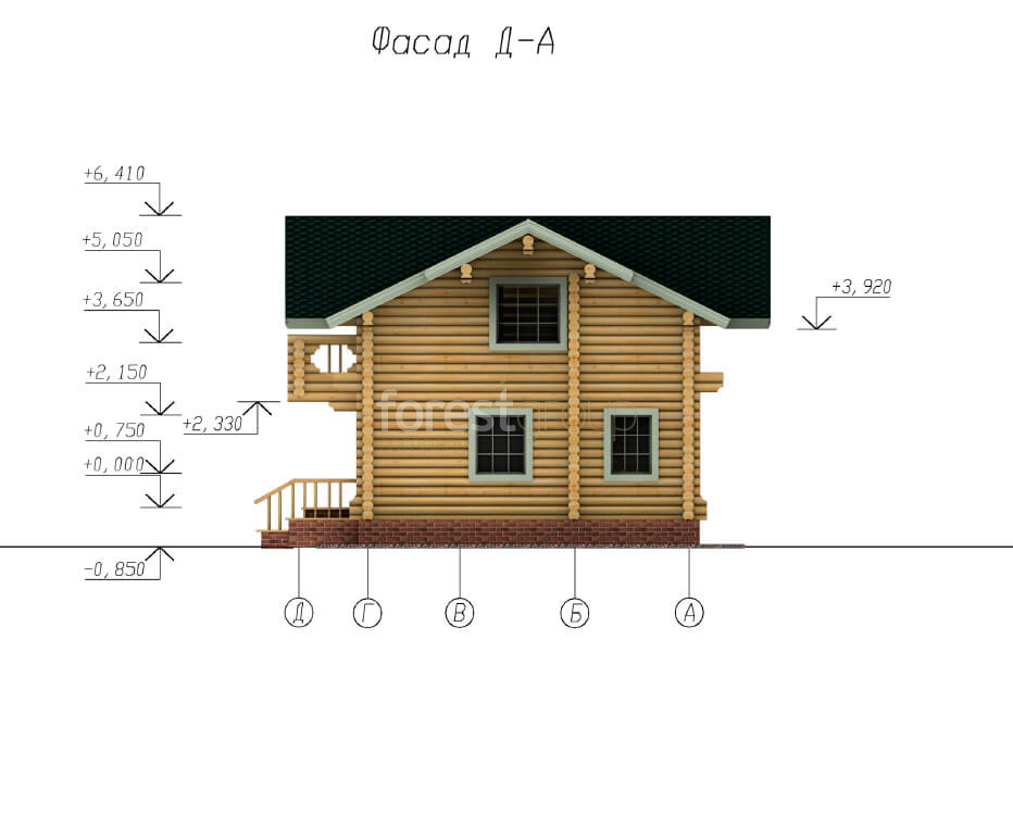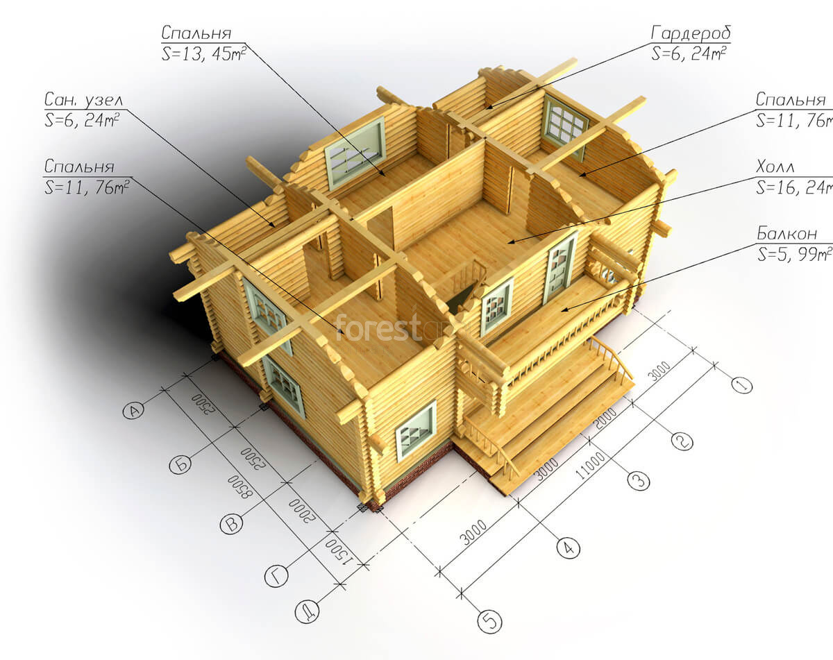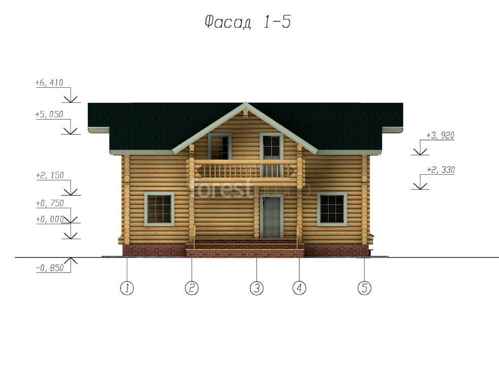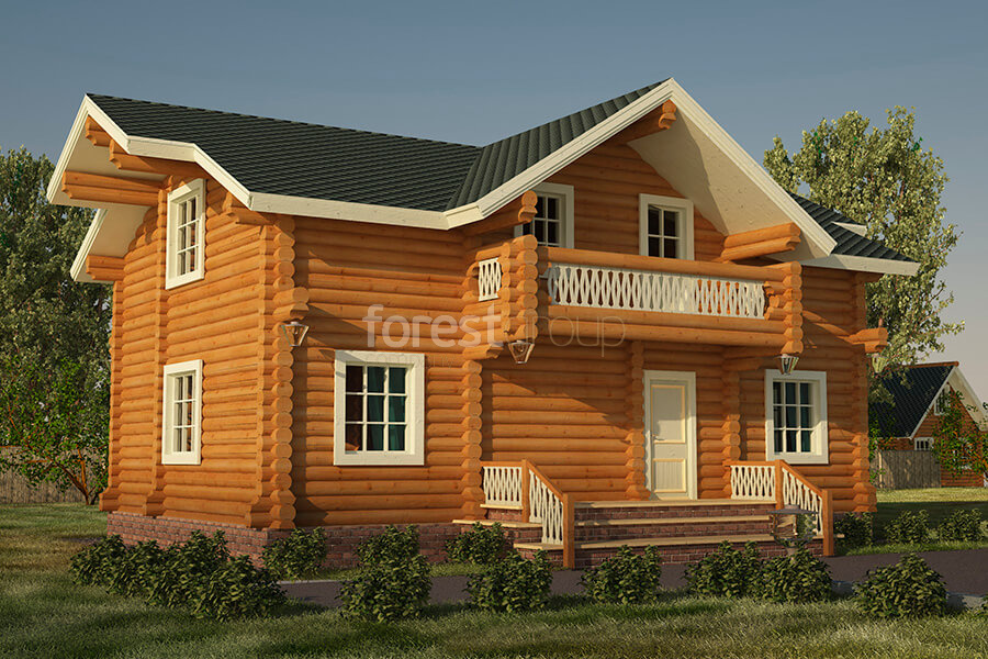 Двухэтажный дом из бревна, в проекте 3 спальни, балкон.