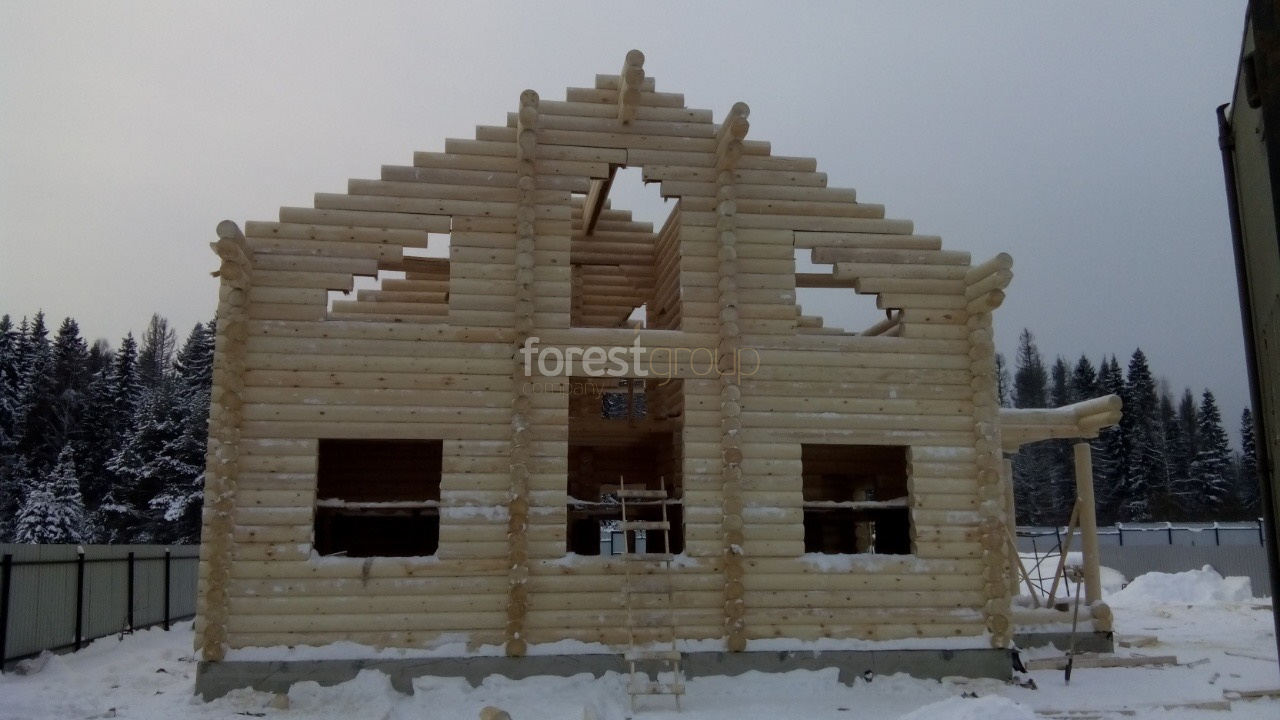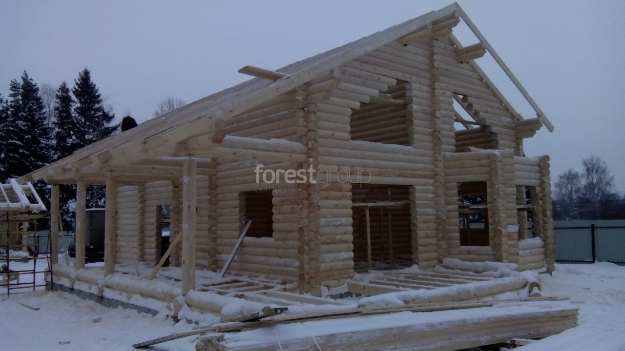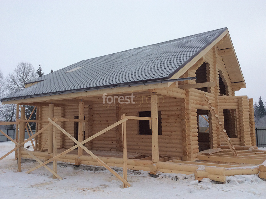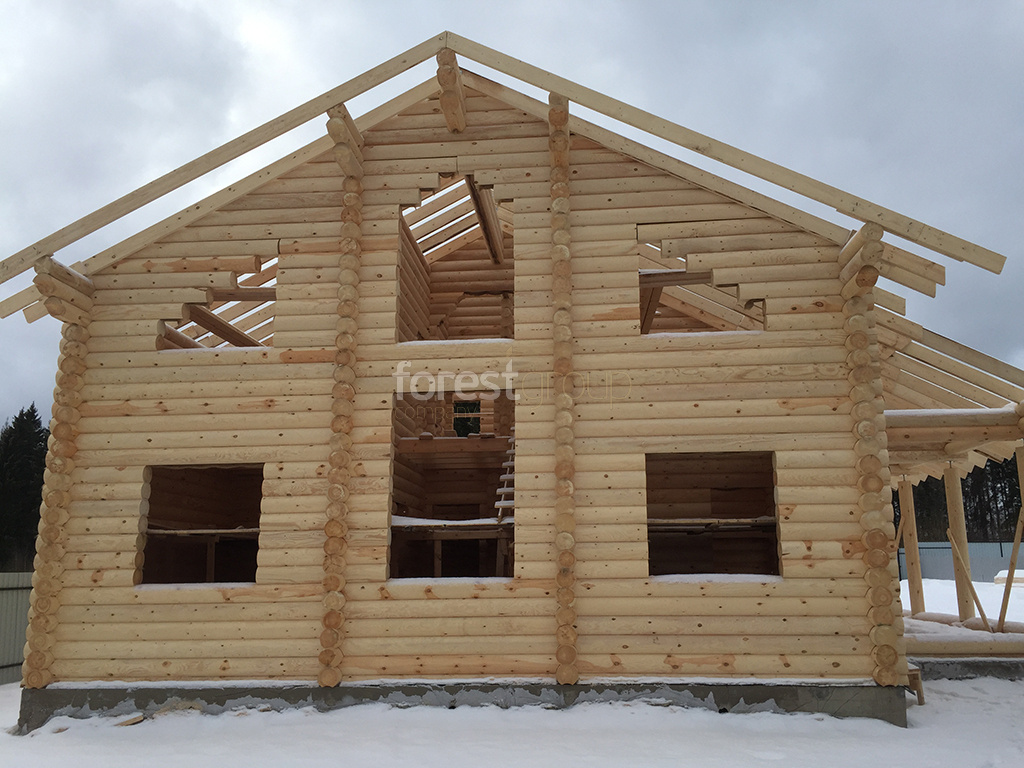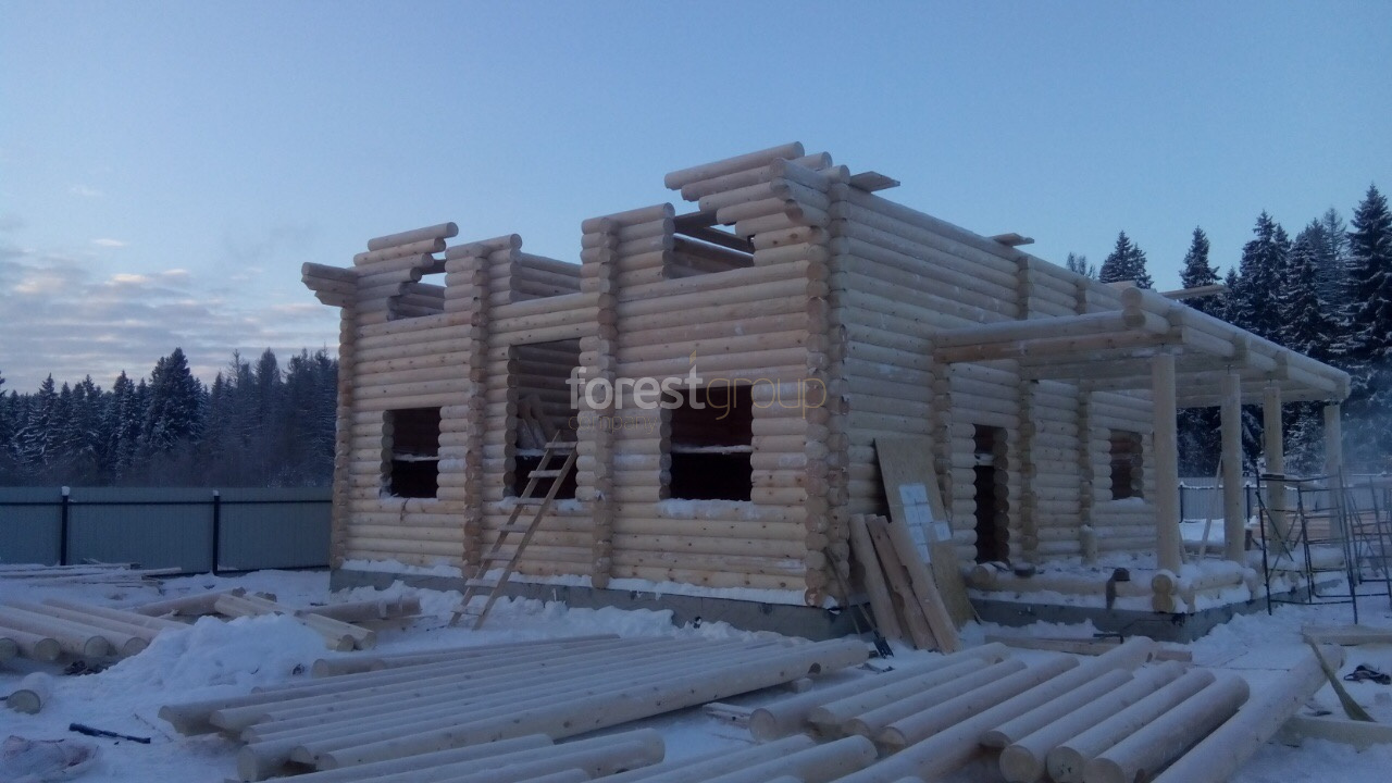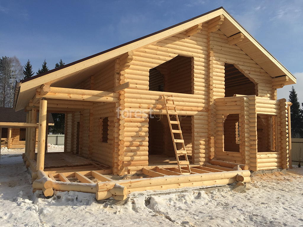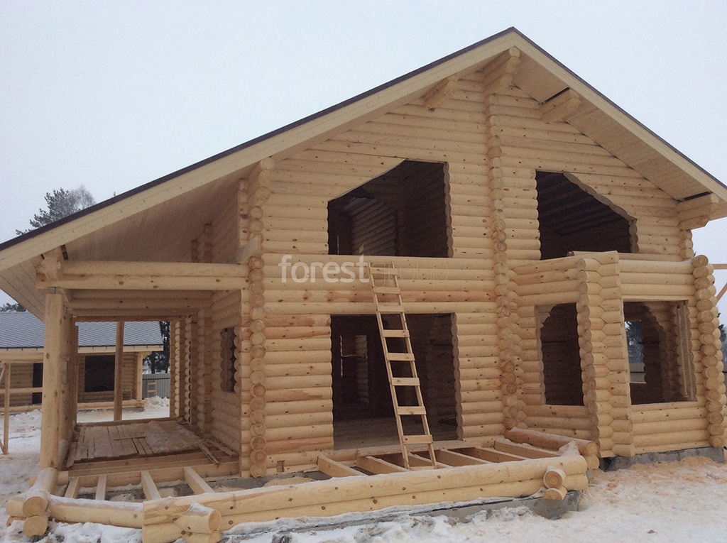 В перечень услуг компании «Группа Форест» входит строительство сооружений с применением срубов из оцилиндрованного бревна, включая создание проекта, сборку, монтаж конструкции и сдачу объекта.